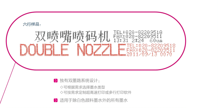 小字符喷码机的用途:IP55操作温度范围5-40°C相对湿度范围(无冷凝)最大95%电源供给100-250V 50/60Hz额定功率200W重量29KG相关认证 TUV/GS,CE标记,FCC性能喷头种类小号、中号、大号、颜料喷头可喷印行数1-5行喷印高度0.8-25mm喷印方向全方位最高速度(单行喷印)6.27m/s一般特征WYSIWYG背光式液晶屏,480×128象素内置图案和日期编辑功能EAN、ITF、Code39、Code128条码999组讯息/图案存储多种语言显示高达9倍粗体喷印最大信息长度1365字符日期、班次、批号、流水号、时间、序列数自动推算时间讯息、流水讯息、流水式条码逆向/倒转/旋转字体喷印QWERTY标准键盘油墨丁酮基、混合基、酒精基接口连接光敏电眼接口流水线速度同步器接口外置警报器接口RS-232界面接口RS-485界面接口。